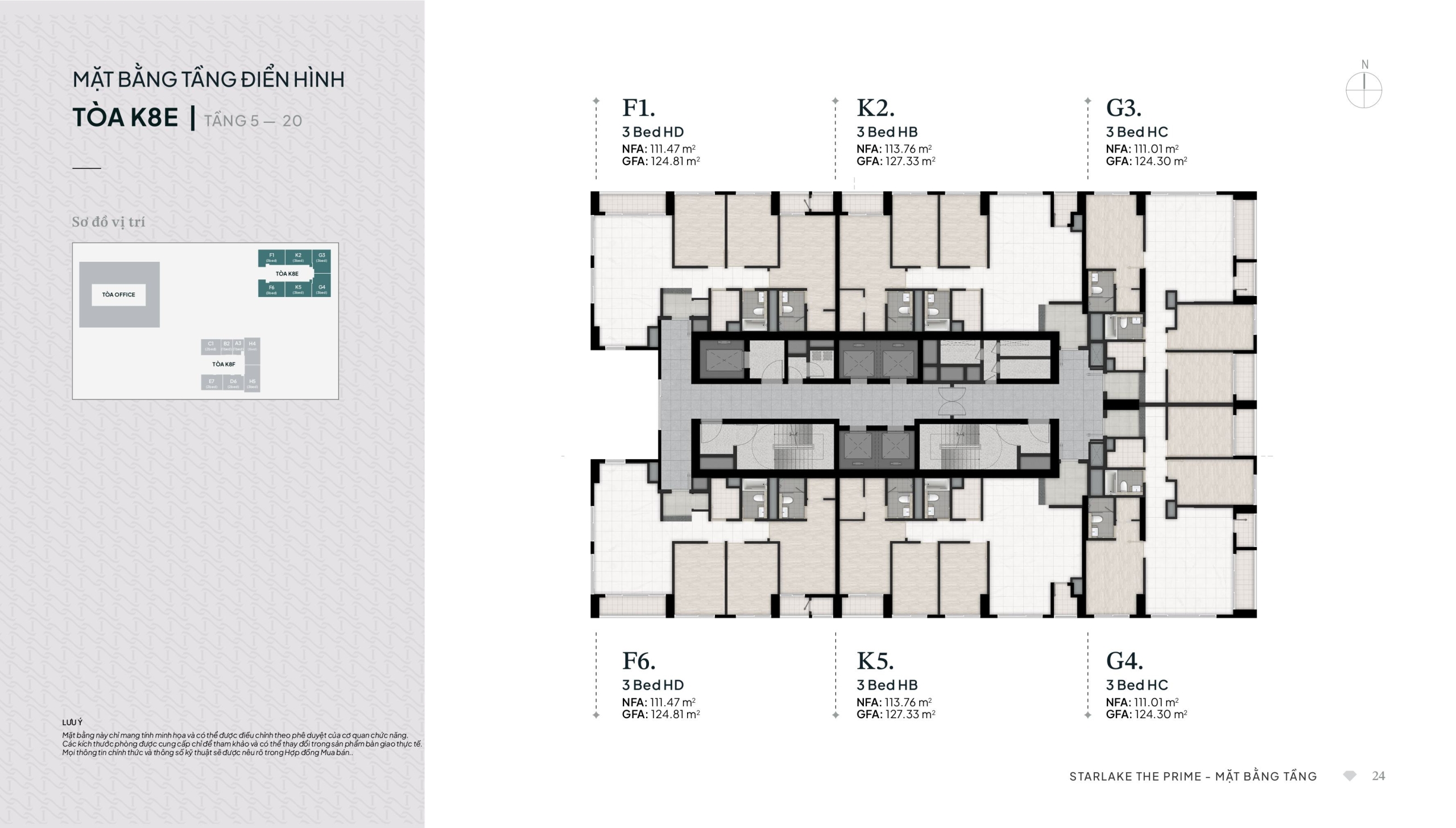 Loại Căn F (Mã F1 & F6) – 3 Phòng ngủ: Diện tích thông thủy 111.47 m²; Diện tích tim tường 124.81 m². Tổng số lượng: 46 căn (phân bổ từ tầng 4-26).