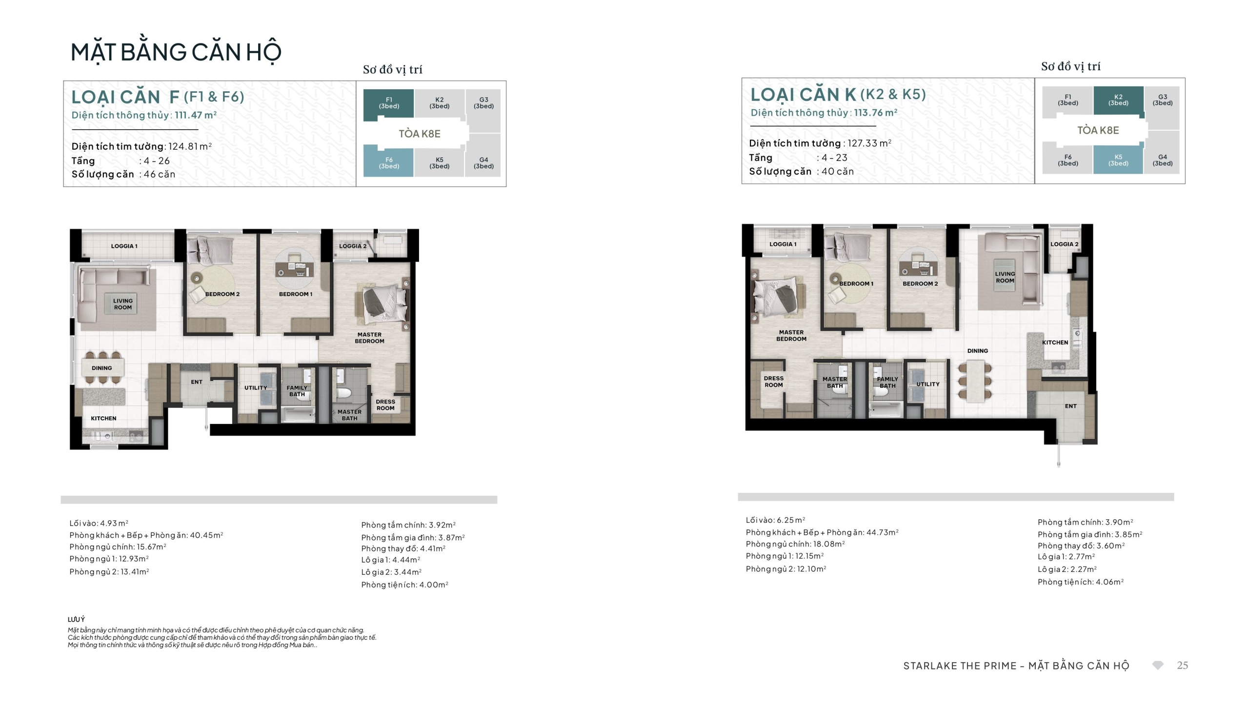 Loại Căn K (Mã K2 & K5) – 3 Phòng ngủ: Diện tích thông thủy 113.76 m²; Diện tích tim tường 127.33 m². Tổng số lượng: 40 căn (phân bổ từ tầng 4-23).