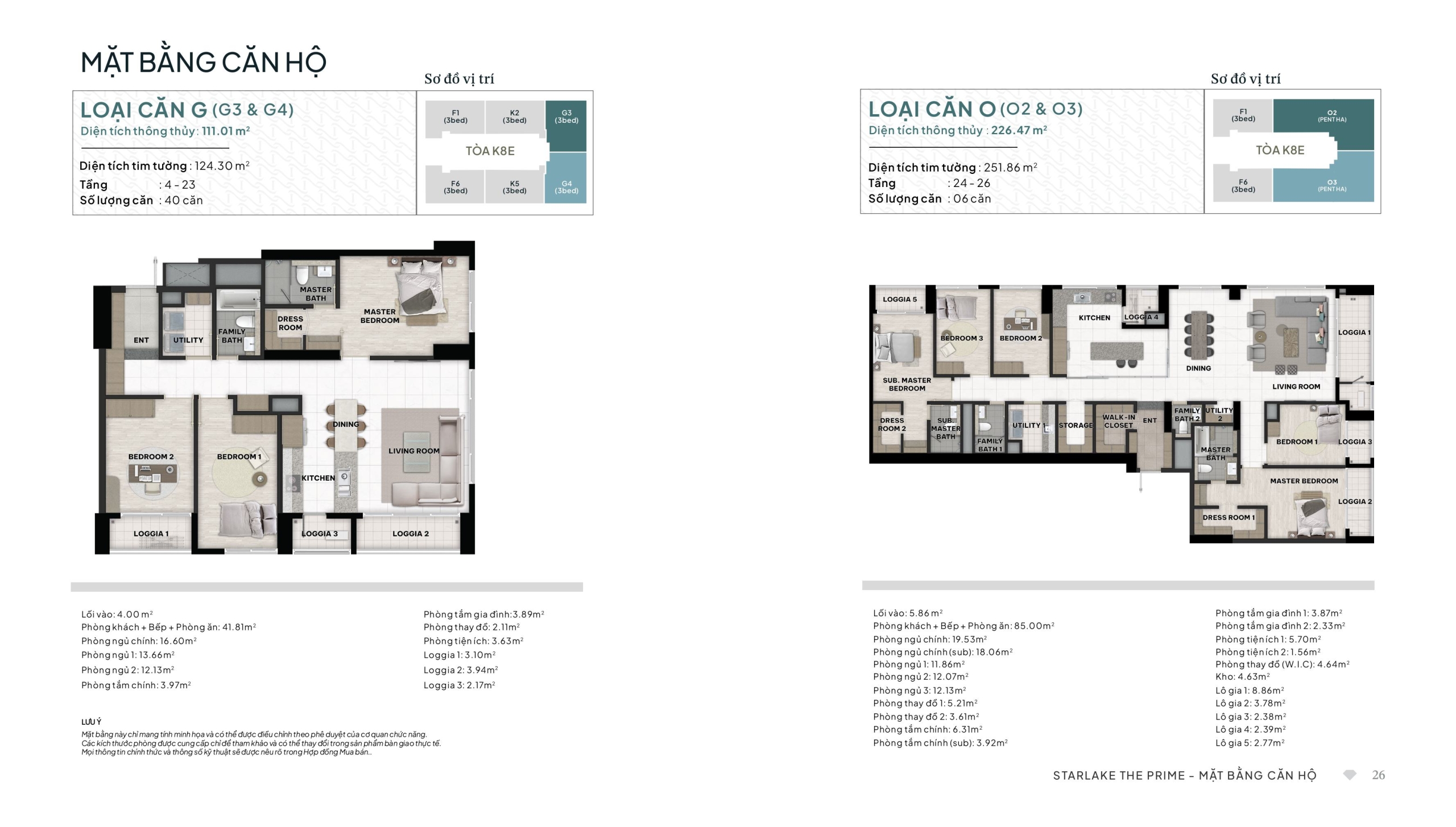 Loại Căn O (Mã O2 & O3) – Penthouse 3 Phòng ngủ: Diện tích thông thủy 226.47 m²; Diện tích tim tường 251.86 m². Tổng số lượng cực giới hạn: 06 căn (phân bổ tại tầng 24-26).