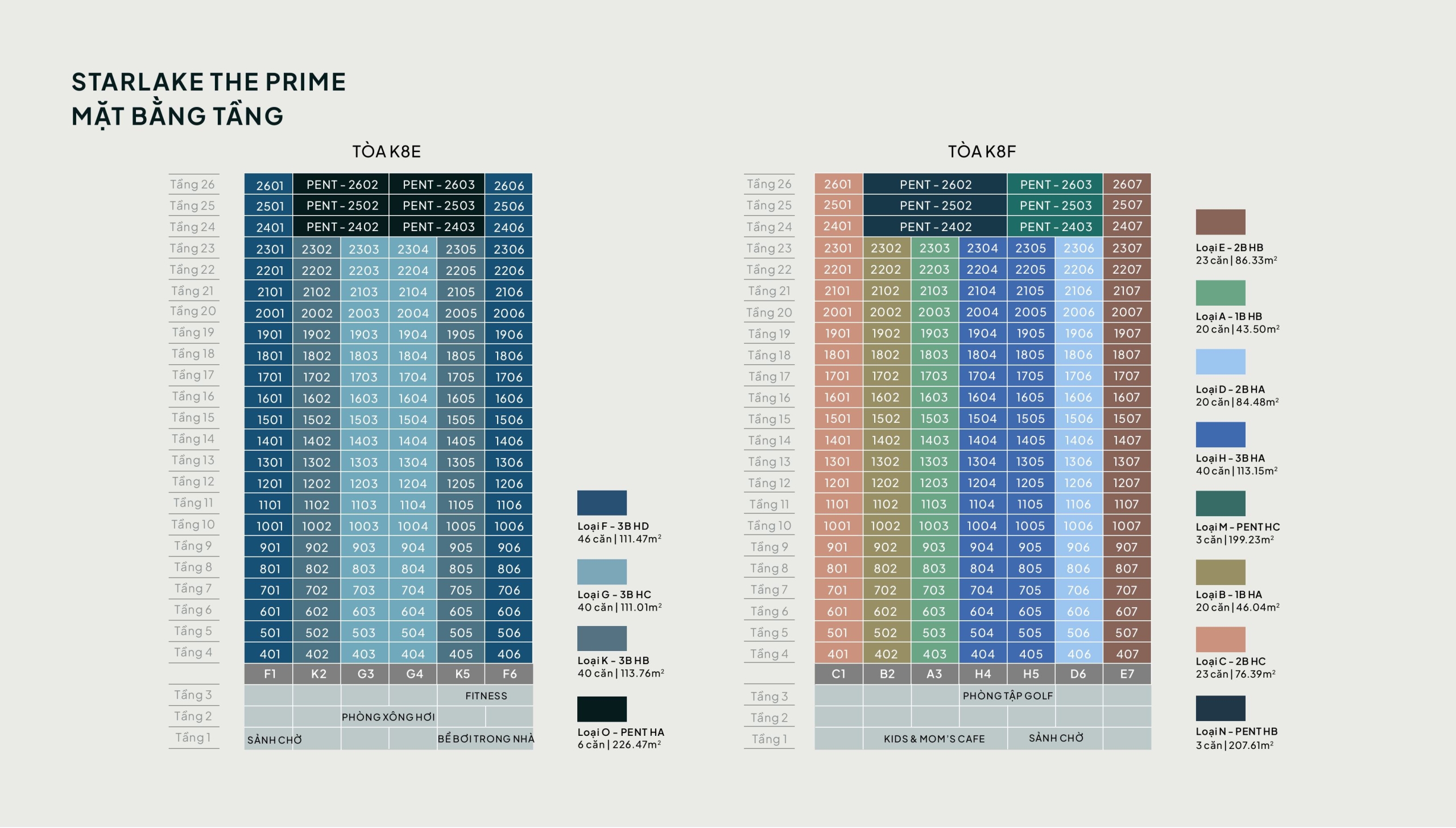 Tầng 1 – Tầng 3: Dành cho hệ thống tiện ích đặc quyền như Sảnh chờ, Bể bơi trong nhà, Phòng xông hơi, Fitness (Tòa K8E) và Kids & Mom’s Cafe, Sảnh chờ, Phòng tập Golf (Tòa K8F).