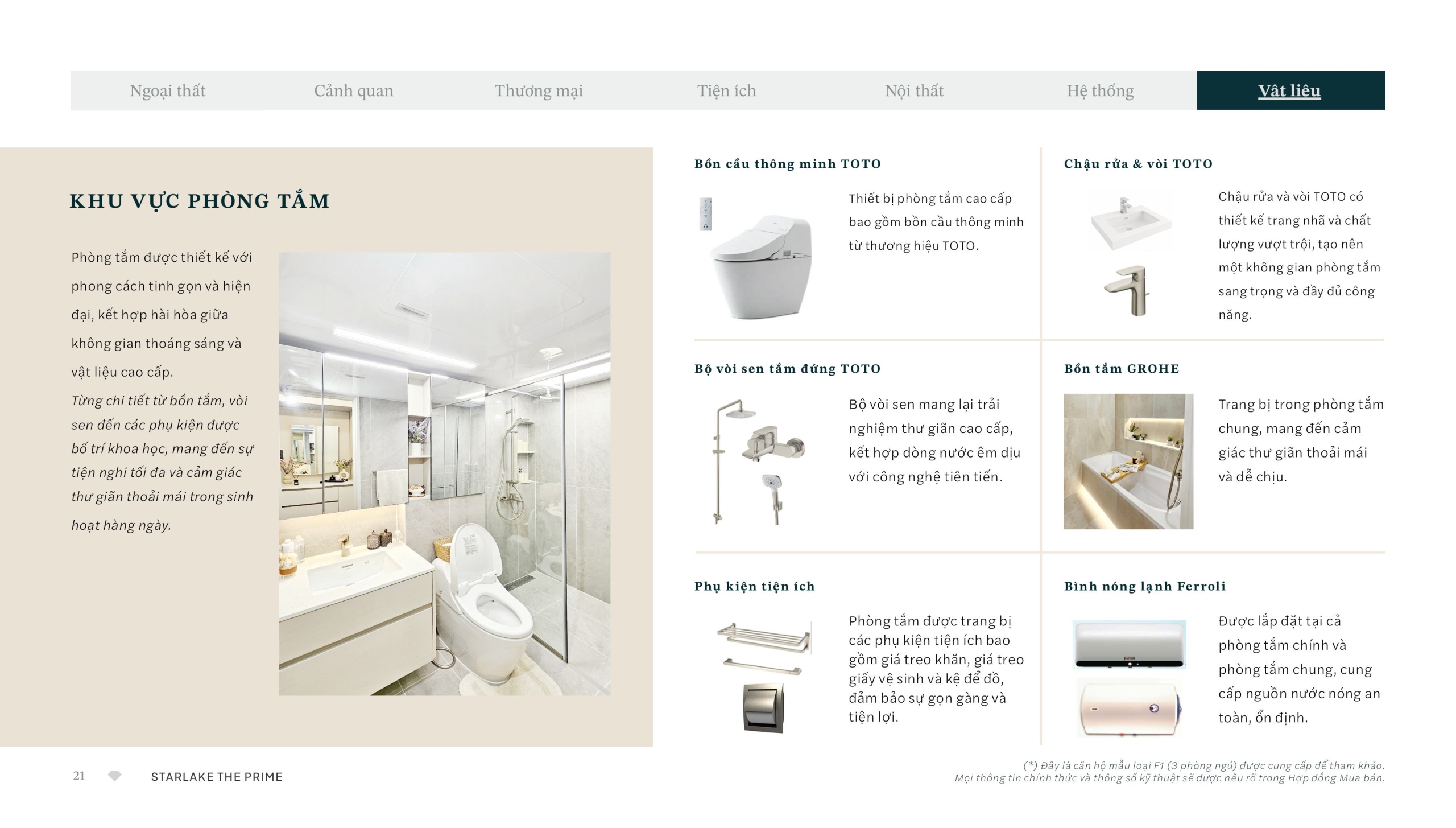 Thiết bị TOTO cao cấp: Gồm bồn cầu thông minh, chậu rửa, vòi rửa và bộ vòi sen tắm đứng.