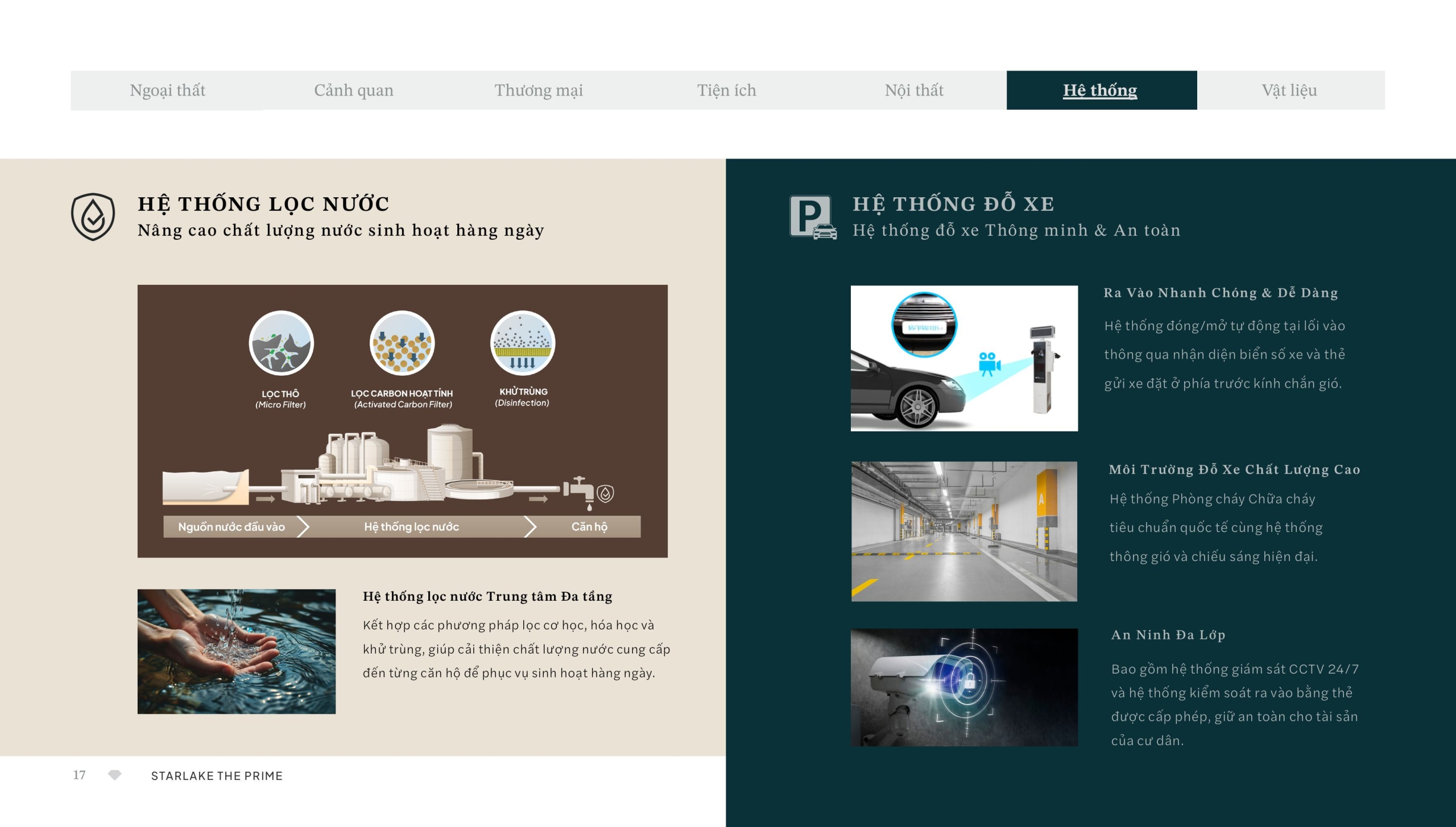 1. Hệ thống lọc nước: Sử dụng hệ thống lọc nước Trung tâm Đa tầng, kết hợp các phương pháp lọc cơ học (lọc thô), hóa học (lọc carbon hoạt tính) và khử trùng. Điều này giúp cải thiện và nâng cao chất lượng nước sinh hoạt hàng ngày cấp đến từng căn hộ.