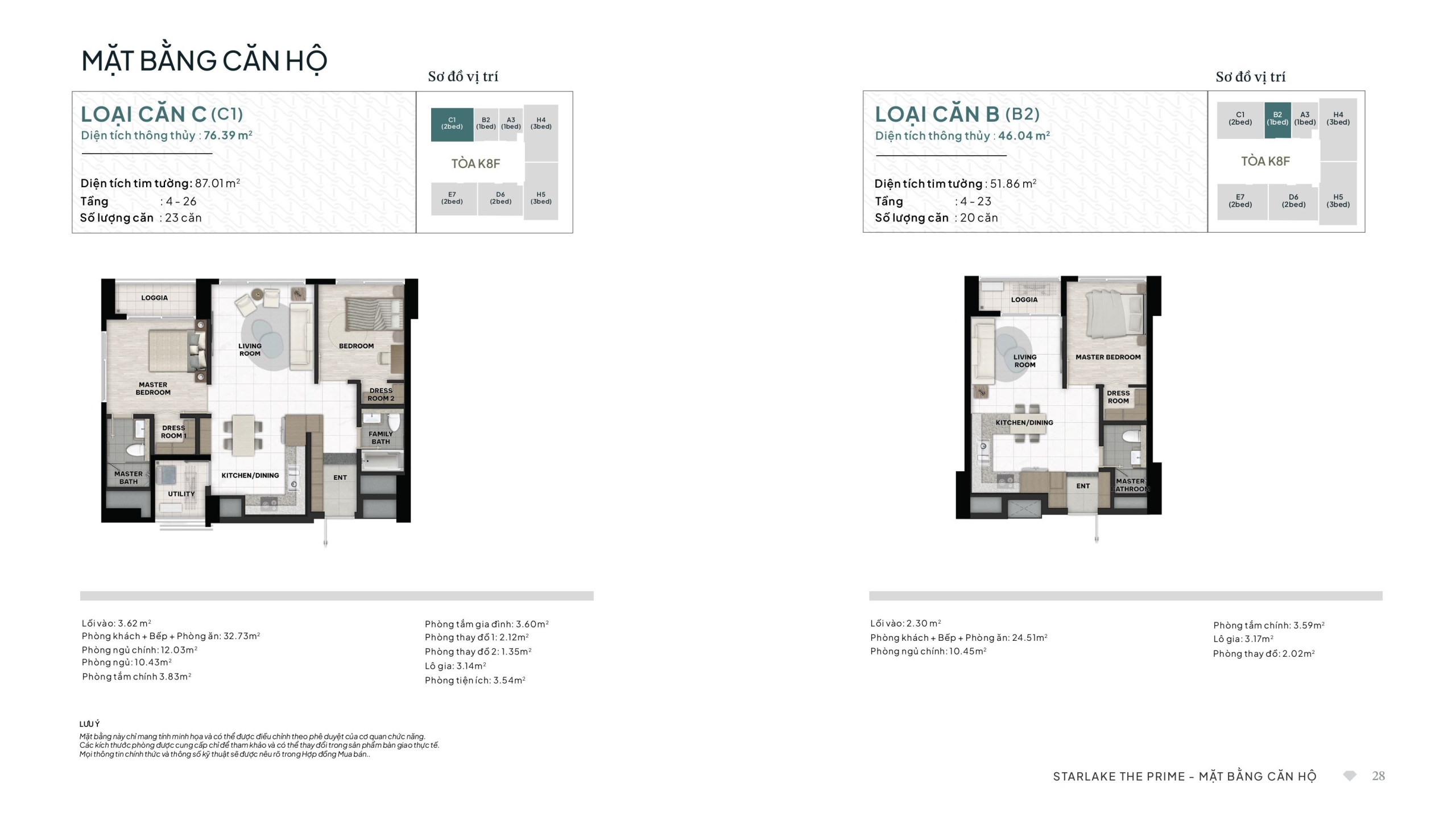 Loại Căn C (Mã C1) – 2 Phòng ngủ: Diện tích thông thủy 76.39 m²; Diện tích tim tường 87.01 m². Tổng số lượng: 23 căn (tầng 4-26).