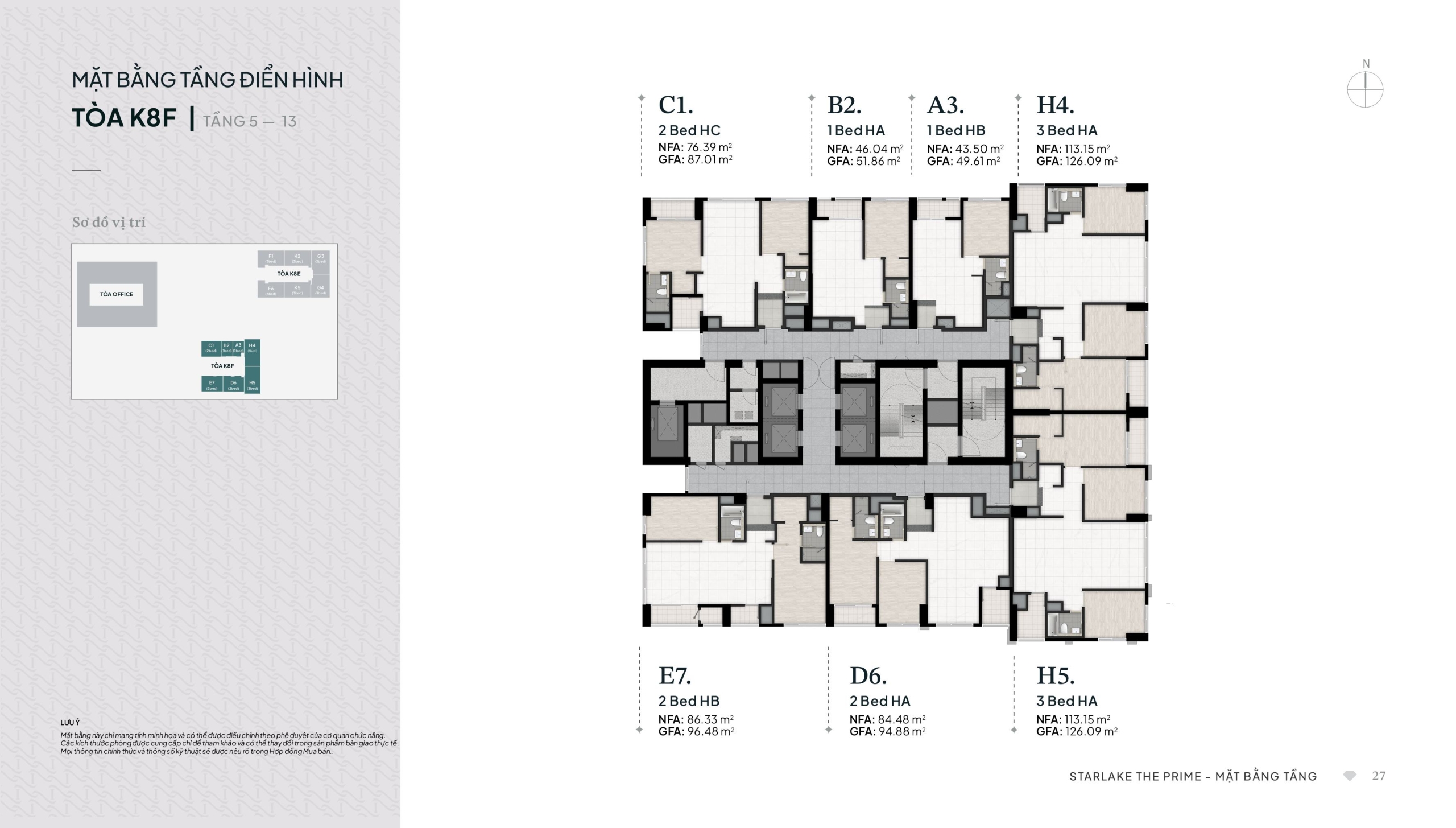 Thiết kế tầng điển hình: Tòa K8F có mật độ 7 căn/tầng, gồm các mã căn: C1, B2, A3, H4, H5, D6, E7.