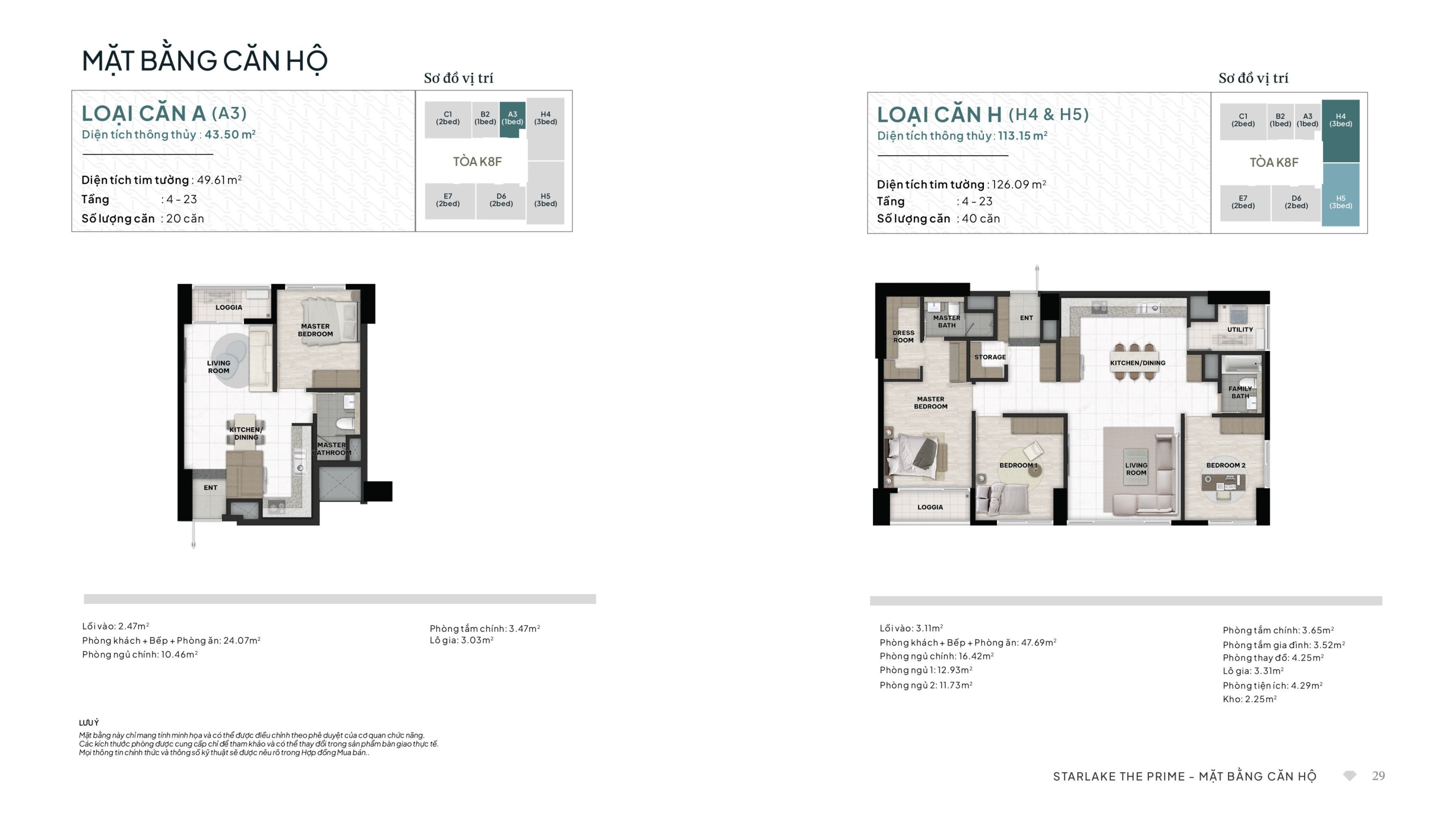 Loại Căn H (Mã H4 & H5) – 3 Phòng ngủ: Diện tích thông thủy 113.15 m²; Diện tích tim tường 126.09 m². Tổng số lượng: 40 căn (tầng 4-23).