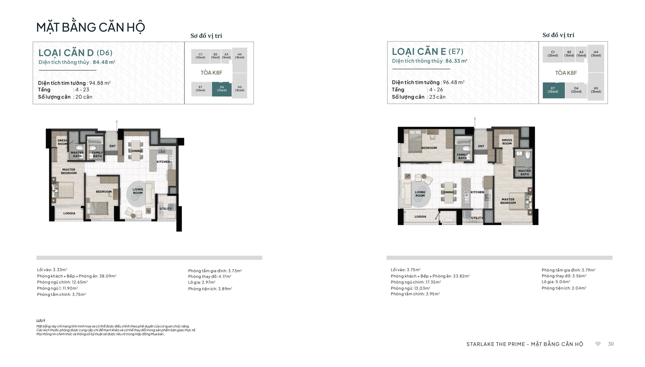 Loại Căn E (Mã E7) – 2 Phòng ngủ: Diện tích thông thủy 86.33 m²; Diện tích tim tường 96.48 m². Tổng số lượng: 23 căn (tầng 4-26).