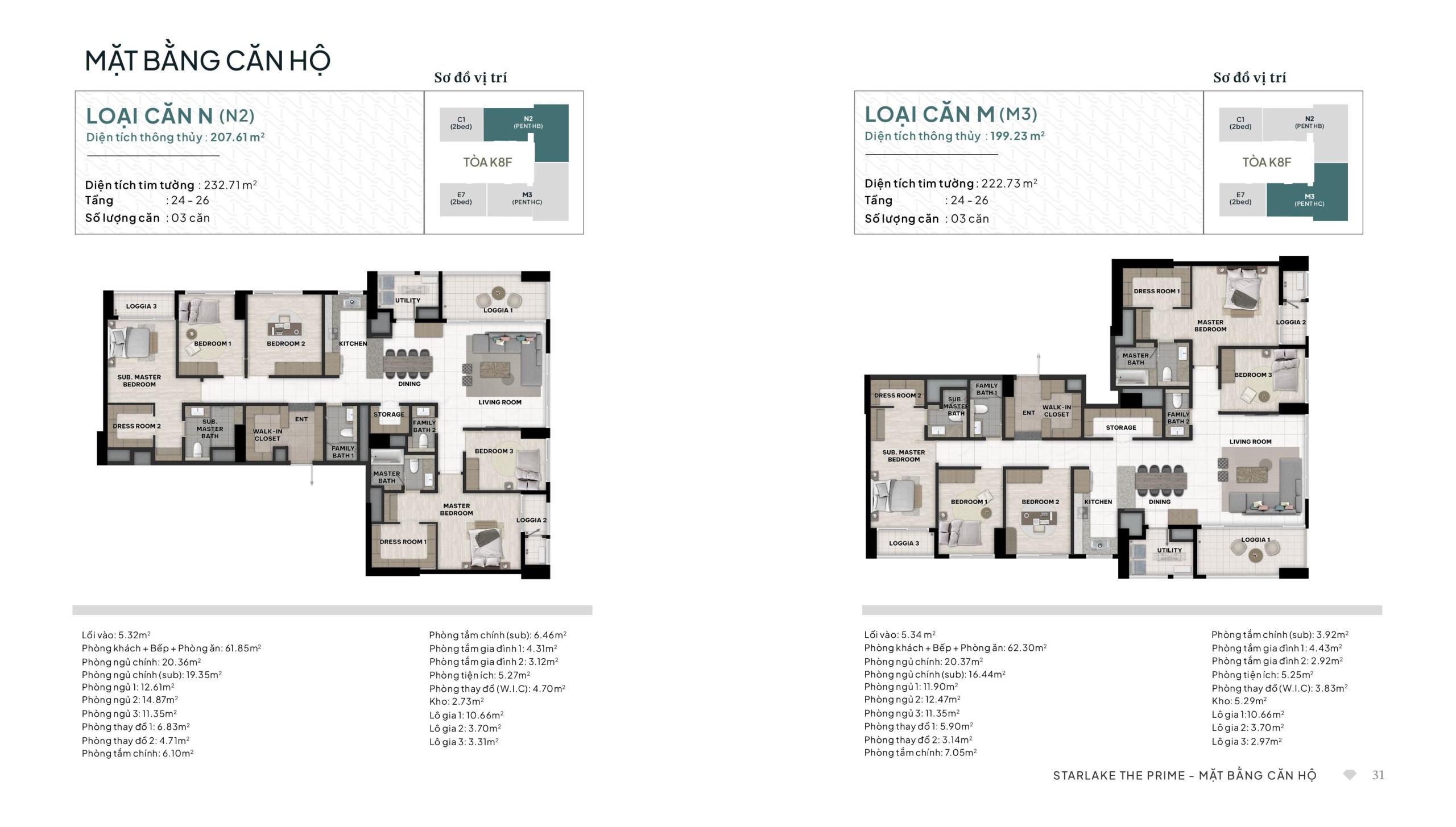 Loại Căn N (Mã N2) – Penthouse 2 Phòng ngủ: Diện tích thông thủy 207.61 m²; Diện tích tim tường 232.71 m². Tổng số lượng: 03 căn (tầng 24-26).