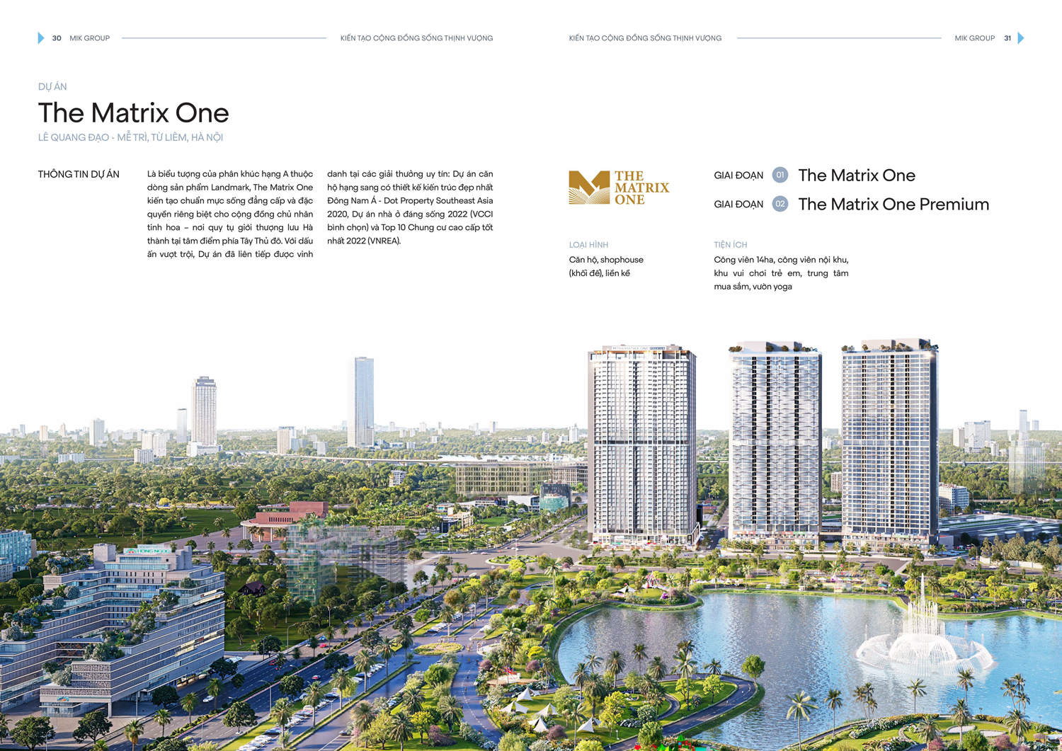 • The Matrix One (Mễ Trì): Biểu tượng sống vượt chuẩn hạng A dành cho giới tinh hoa Hà Nội. Sau thành công của Giai đoạn 1, MIK Group tiếp tục triển khai Giai đoạn 2 với 2 tòa tháp mới, cung cấp 990 căn hộ cao cấp và hệ thống shophouse khối đế.